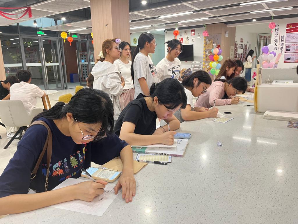 大厅一侧静默而深情。同学们伏案书写,将思念与牵挂倾注笔端。一封封家书,不仅传递亲情,更成为这个中秋最温暖的纪念。