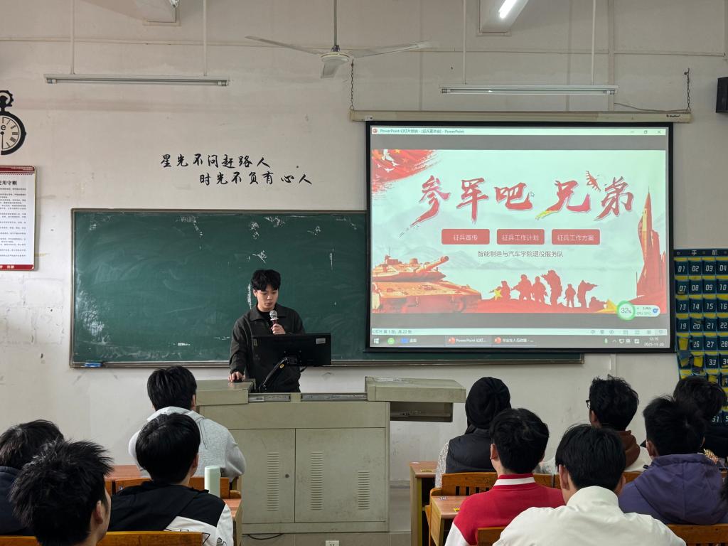 为精准服务2026届毕业生应征入伍需求,打通政策宣传“最后一公里”,2025年11月20日,智能制造与汽车技术学院学生退役服务队在博学楼B506课室组织开展了专场征兵政策宣讲会。本次活动聚焦毕业生群体特点,通过“政策解读+经验分享+互动答疑”三位一体的形式,为有志参军报国的学子提供了指导和服务。