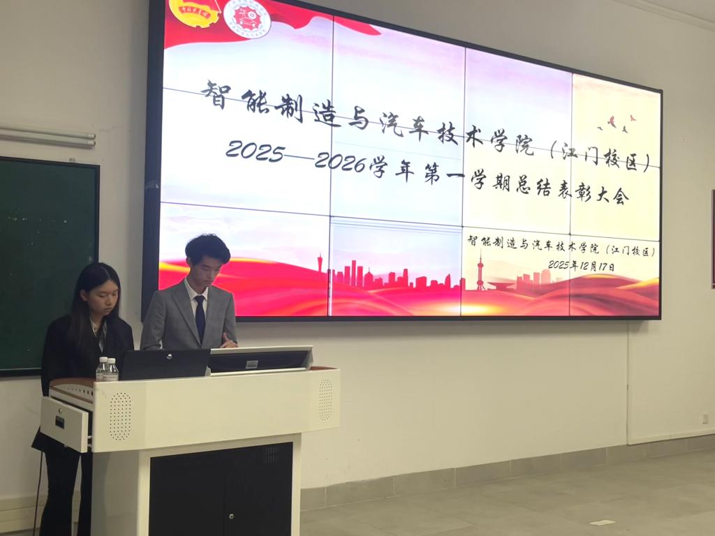 为全面总结本学期学生组织工作成效,系统梳理经验、凝聚青春力量,进一步表彰先进典型、激发全体学子的积极性与创造性,2025年12月17日19:00,智能制造与汽车技术学院2025年秋季学期学生组织总结表彰大会在教2-104课室如期举行。学院各组织指导老师以及各级辅导员、各学生组织骨干及全体受表彰同学参会,全体参会人员身着统一校服,严格遵守会议要求,提前10分钟有序入场签到,以昂扬的精神面貌、严谨的纪律作风,共同见证这场属于青春奋斗者的荣誉盛会。