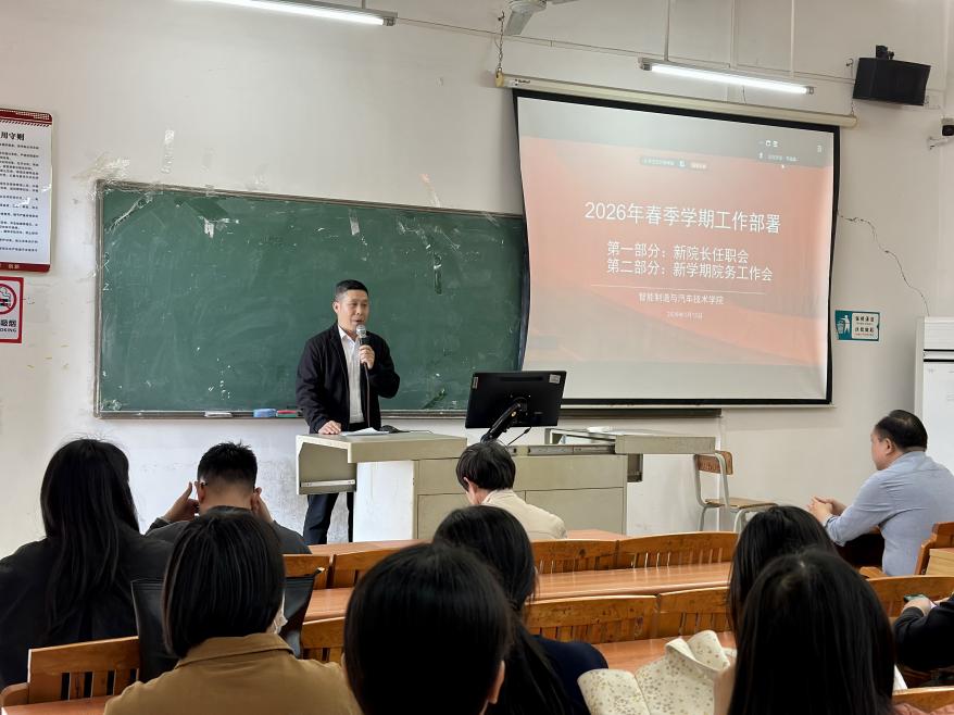3月13日,智能制造与汽车技术学院在广州校区博C506课室隆重召开了2026年春季学期工作部署会,会议通过线上线下相结合的方式进行,江门校区老师线上参会,学院分管校领导孙虎、人事与质量部部长石朝阳、教师及行政人员共72人齐聚一堂,共同擘画新学期发展蓝图。会议分为新院长任职会和学院新学期院务工作会两部分,明确了新学期围绕高质量发展为目标的具体工作思路。