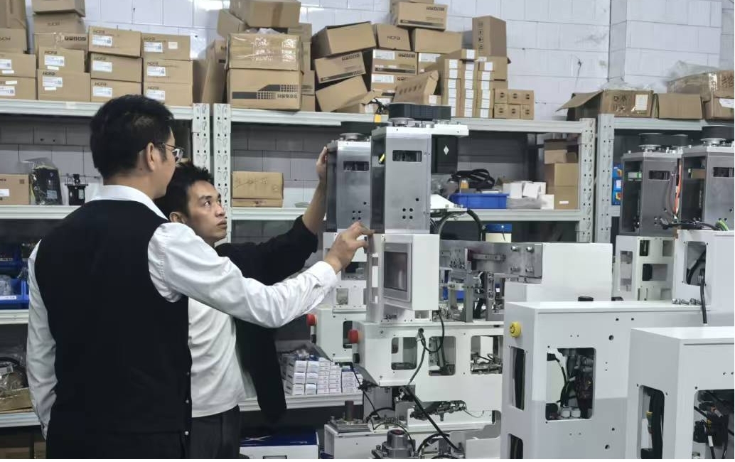 在蔡振得总经理的带领下,郑老师先后参观了公司生产车间、研发中心及产品展示区。蔡振得总经理详细介绍了公司的核心产品矩阵,从手动调距到全伺服自动调距系列铆钉机,从套PIN电磁热熔机再到高精度相机对位电磁热熔机,每一款设备都彰显着得为科技的技术沉淀。其中,铆钉机凭借首创双动力铆合机构,实现铆钉精准压入与PCB板层间高对准度;全伺服两轴和四轴铆钉机以伺服驱动技术赋能高效生产,层偏小、产能高的优势获得参观团队高度关注;而DWCCD750相机对位电磁热熔机凭借±15um的精准对位精度,以及高效节能的电磁热熔头设计,展现了公司在精密设备领域的技术突破。蔡振得总经理还重点分享了公司在新材料应用、新工艺改良方面的研发成果,强调公司始终坚持研发、实验、生产、安装调试、服务及满足客户定制功能的需求。