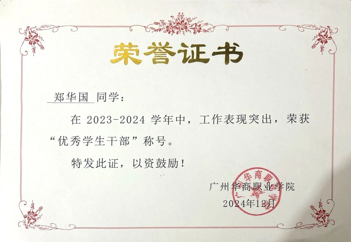 6.荣获广州华商职业学院“优秀共青团员”、智能制造与汽车学院“优秀共青团员干部”、“优秀班干部”称号;