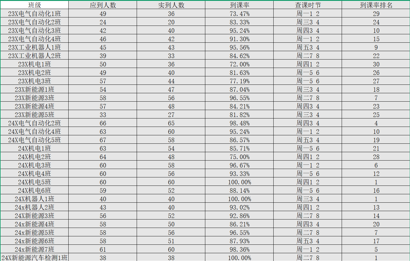 团委办公室工作人员对智能制造与汽车学院(江门校区)第十四周的学生课堂情况和学生到课率进行了统计。现将第十四周的查课数据汇总结果给予公布。