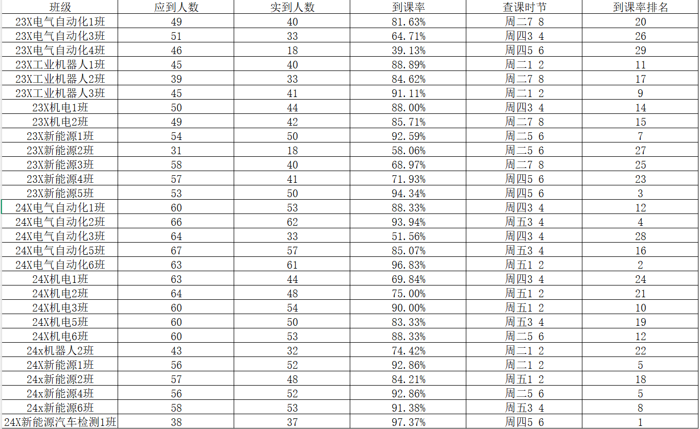 智能制造与汽车学院团委工作人员对智能制造与汽车学院(江门校区)第十五周的学生课堂情况和学生到课率进行了统计。