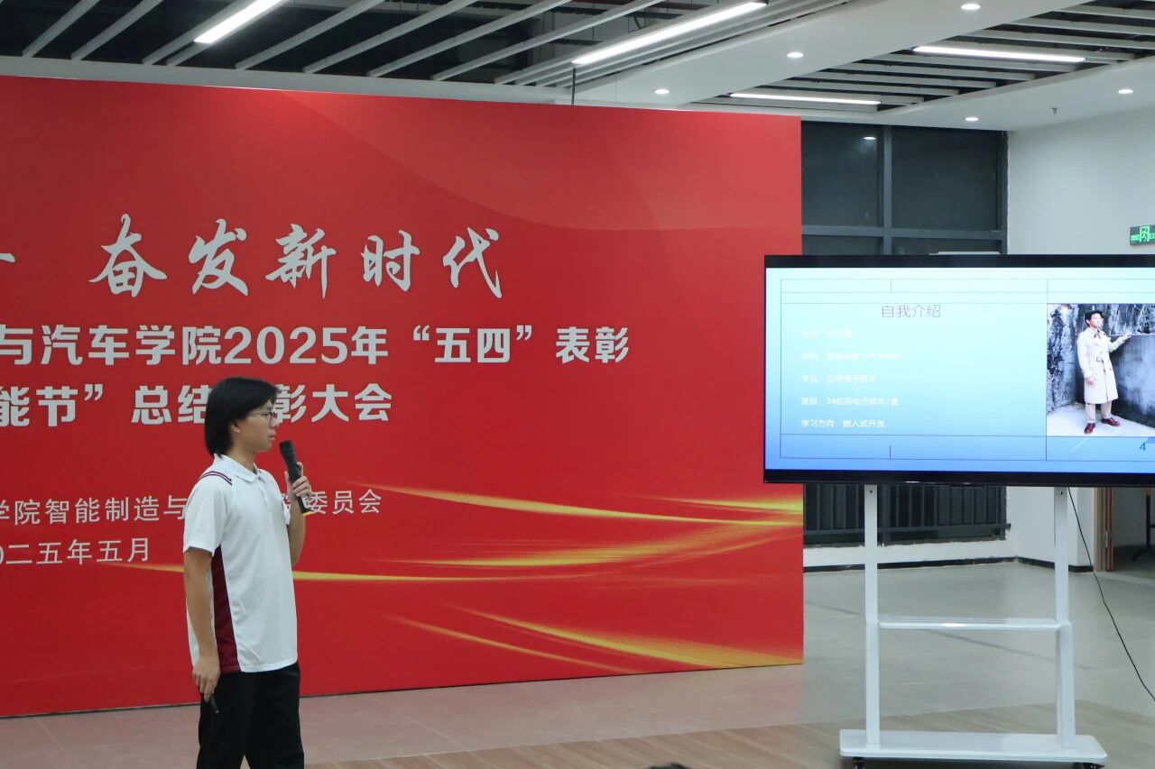 学院团委书记黄琳璇老师宣读《关于表彰智能制造与汽车学院2025年“五四”评优先进个人和集体的决定》和《智能制造与汽车学院关于公布第一届“智能节”获奖名单的决定》,希望受表彰的集体和个人珍惜荣誉,再接再厉,发挥先锋模范作用;并号召学院广大学生以先进为榜样,弘扬“五四”精神,坚定信念,勇担使命。