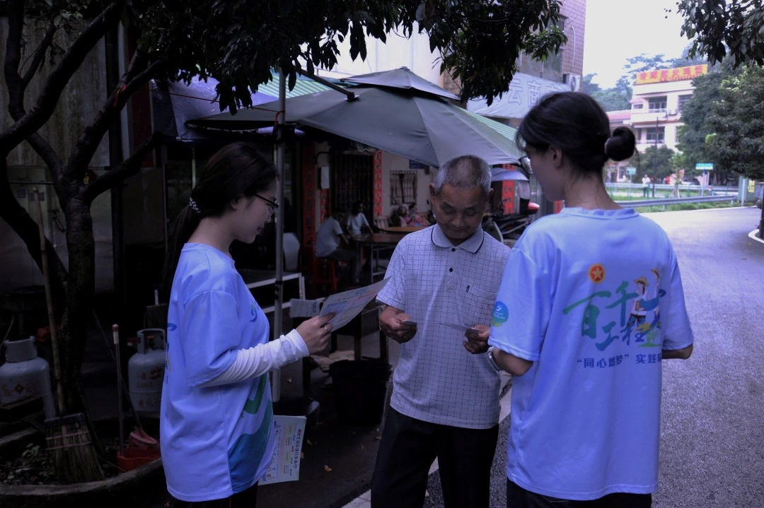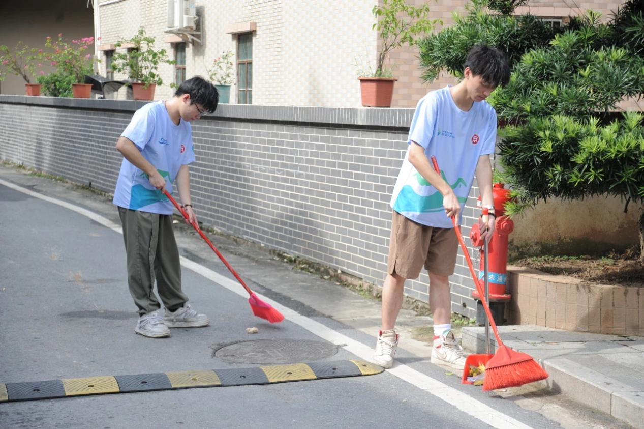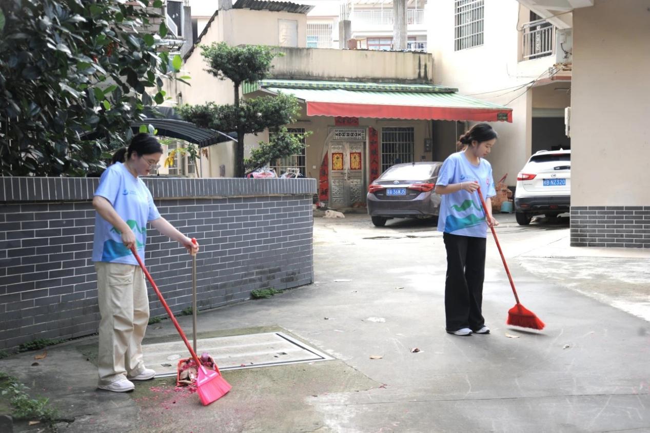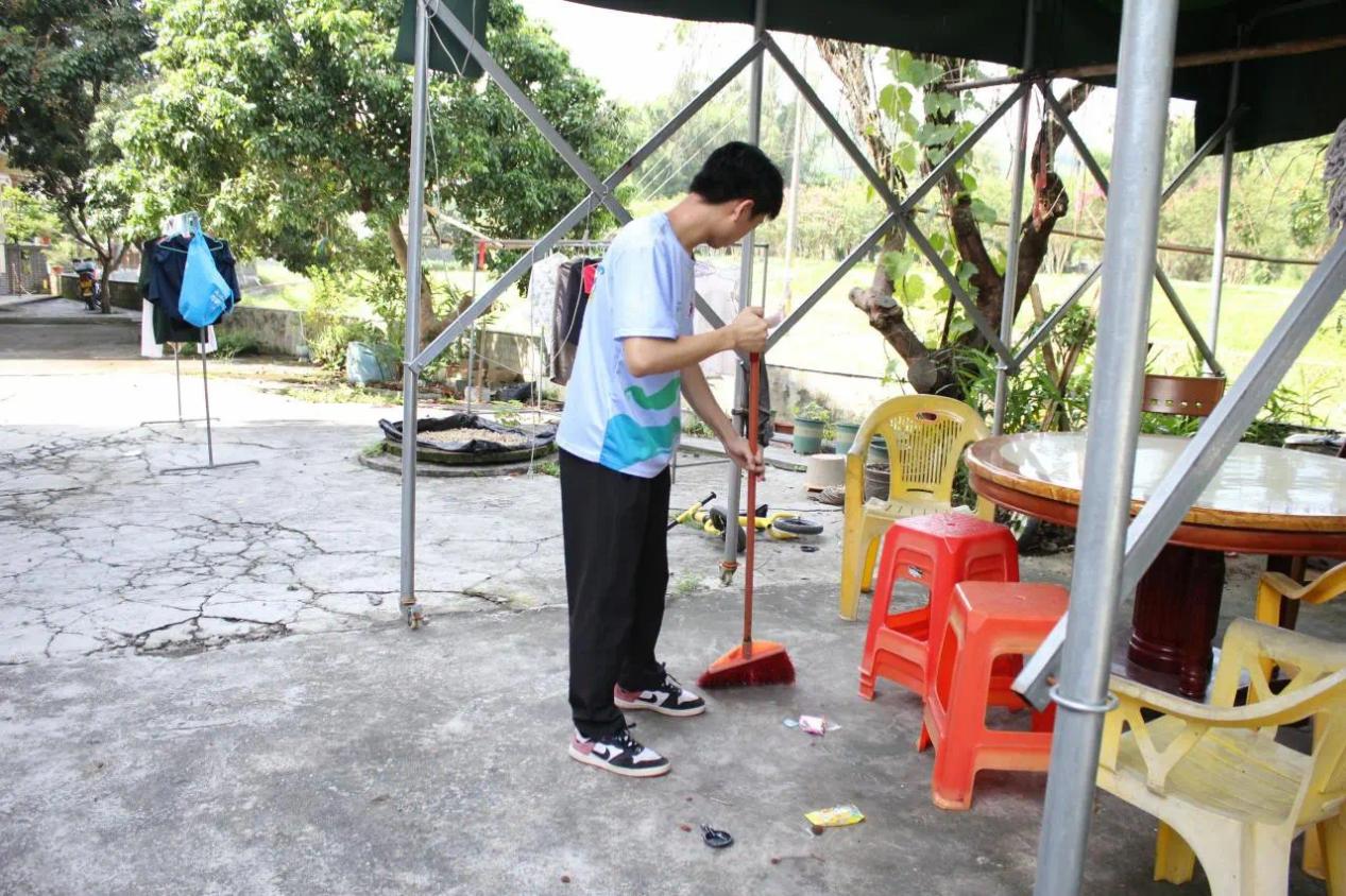 清晨,当第一缕阳光洒在麦村村口的龙眼树下时,“同心燃梦”实践队的队员们已整装待发。他们手持扫帚、簸箕,与麦村清洁工人并肩开启环村清扫工作。队员们分工明确又默契协作:有人专注清理树下腐烂的龙眼,指尖沾了污渍也毫不在意;有人细心清扫满地落叶,连砖缝里的碎屑都不放过;还有人负责清扫路面生活垃圾,推着沉重的簸箕往返于垃圾桶与清扫点之间。日头渐升,汗水顺着队员们的脸颊滑落,浸湿了衣背,可没人喊累。望着干净整洁的柏油路向远方延伸,实践队员们望着自己亲手打扫的村庄,脸上洋溢着青春的热忱,让这个清晨的村庄更添了几分暖意。、