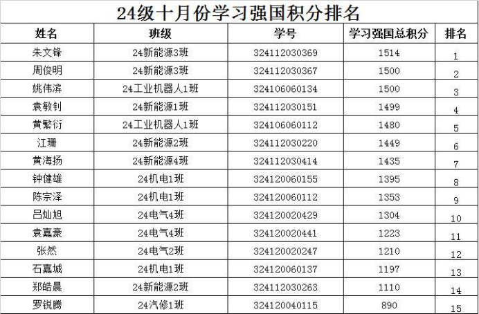 为进一步加大“学习强国”学习平台的宣传推广力度,充分发挥平台的引领作用,深入学习贯彻党的二十届三中全会精神,营造真学、深学、细学的学习氛围,智能制造与汽车学院以“学习强国”积分情况为依据,每月持续推出学习强国积分排行榜,对学习积分优秀的同学进行亮晒,推动“学习强国”学习教育在我院走深、走实、走心,掀起“学思践悟强担当,勇毅前行建新功”的热潮。