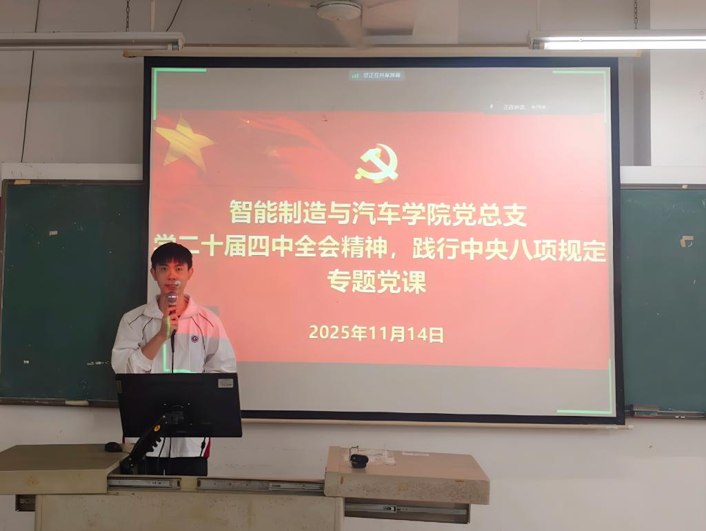 为了深入学习贯彻落实中央八项规定精神,强化同学们的政治理论武装,提升党性修养与思想觉悟,2025年11月14日,智能制造与汽车学院党总支在博学楼A507课室顺利开展11月书记上党课活动,智能制造与汽车学院党总支副书记姚柏洲同志,学院党总支组织委员、学生第一党支部书记富心彤同志,学生党员以及入党积极分子参加了本次会议。
