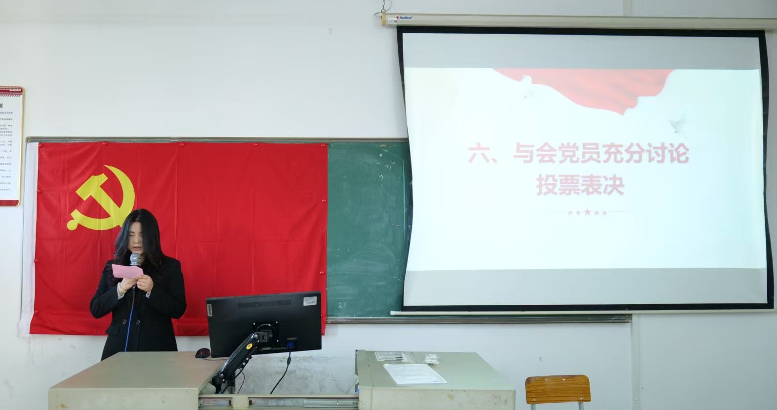 大会第六项议程,支部党员投票并宣布投票结果。经与支部委员会党员充分讨论并投票,此次投票采取不记名投票形式,投票结果显示,同意接收陈灶鹏等6名同志转为正式党员,投票人数超过应到会有表决权正式党员的半数,同意转为其为正式党员。