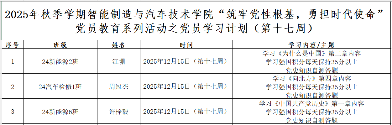 为深化党员的自我教育管理模式,切实提升党员自我教育管理实效,智能制造与汽车技术学院党总支针对现阶段党员教育管理不足现状,积极探索,组织开展党员自我教育学习活动,锚定学习目标,认真贯彻落实,狠抓推进整改,抓好奖励惩罚。现将第十七周党员学习计划及检查结果公布如下:
