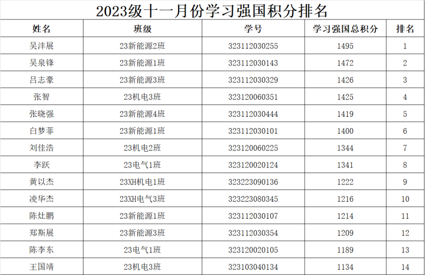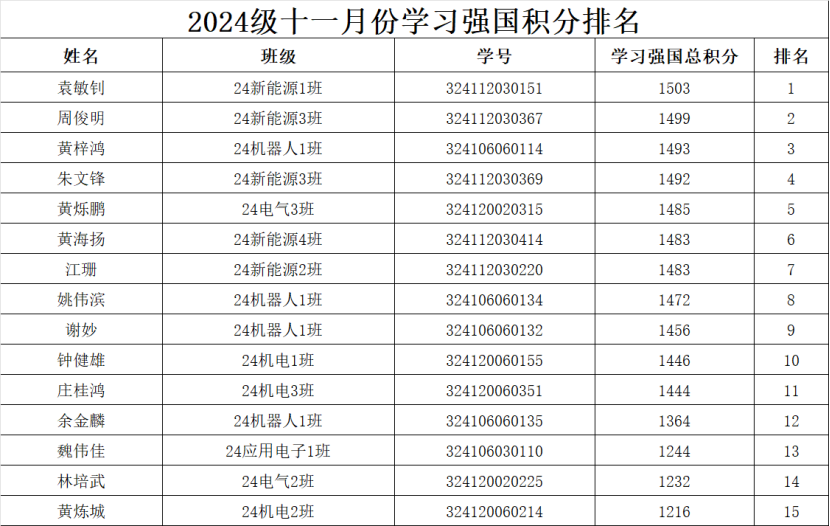 为进一步加大“学习强国”学习平台的宣传推广力度,充分发挥平台的引领作用,深入学习贯彻党的二十届三中全会精神,营造真学、深学、细学的学习氛围,智能制造与汽车技术学院以“学习强国”积分情况为依据,每月持续推出学习强国积分排行榜,对学习积分优秀的同学进行亮晒,推动“学习强国”学习教育在我院走深、走实、走心,掀起“学思践悟强担当,勇毅前行建新功”的热潮。